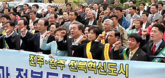 전주시의회 혁신도시추진지원특별위원회가 24일 전주시의회 앞에서 출범식을 가진 후 토공과 주공의 통합 반대를 결의하는 구호를 하고 있다.