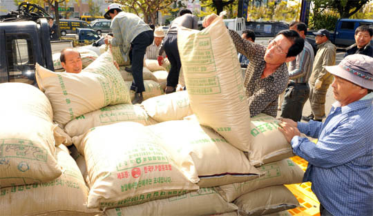 28일 전북농민회 소속 농민들이 완주군청 앞에서 벼 2000포대 야적 시위를 벌이고 직불금 부당 수령자들의 처벌과 농가의 농민들의 생산비 보장을 촉구했다.