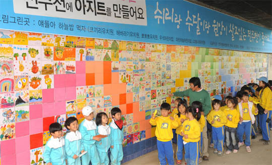 29일 전주천 어은교 아래에서 열린 꼬마들의 공공미술프로젝트 '전주천에 아지트를 만들어요' 준공식에서 유기농 급식운동을 하는 '얘들아 하늘밥 먹자' 소속 어린이집 아동들이 자신들의 고사리 손으로 완성한 그림을 보고 있다.