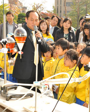 30일 오전 전주시청 앞 노송광장에서 열린 '폐식용유 바이오 연료화 사업' 선포식에 참여한 코끼리 유치원 아이들이 폐식용유를 바이오디젤로 생산하고 있는 정읍 소재 에코솔루션 김명중 공장장이 폐식용유의 정제과정을 설명하고 있다.