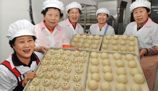 엄마손찐빵'가게의 주인같은 종업원인 김효순, 김정희, 양점례, 김금자, 이영숙씨가 정성껏 만든 찐빵을 들여보이며 환하게 웃고 있다.