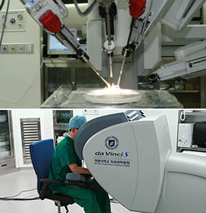 물론 로봇수술은 개복하지 않고 수술중의 환자에게 수혈도 할 필요가 없어 많은 수술보조원이 필요치 않았기 때문에 이날의 로봇수술 광경은 종전의 수술실 모습과 확연한 차이를 보였던 이유였다.