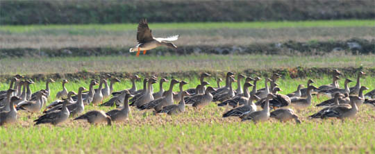 3일 군산 금강하구둑에 반가운 손님들이 찾았다. 쇠기러기 떼가 찾아와 줄을 지어 장관을 이룬 것. 군산하구둑 인근엔 쇠기러기외에도 큰 기러기, 노랑부리저어새, 가창오리, 흰뺨검둥오리 등 20∼30여종이 서식하고 있다. '철새축제'는 11월19일부터 23일까지 열린다.
