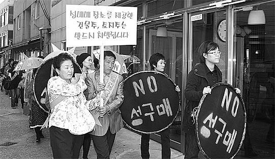 4일 여성권익증진시설과 아동여성보호 전주시연대, 여성단체협의회 등 50여명이 전주 선미촌 일원에서 "성매매 없는 전주 만들기"가두캠페인을 벌이고 있다.