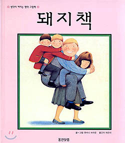 처음엔 제목이 신기했습니다. 돼지책?, 돼지들이 주인공인가? 그러나 표지에는 한 가족의 그림이 있었습니다. 엄마가 아빠, 아들 둘까지 모두 업고 있는 것을 그린 그림이었습니다. 하지만 각 가족 구성원의 표정을 살펴보면 엄마를 제외한 세 명의 가족은 웃고 있는 데 반해, 엄마는 무표정을 짓고 있습니다.