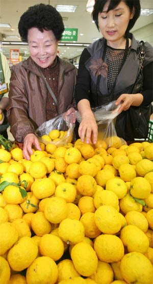 6일 농협 하나로클럽 전주점에서 고객들이 유자를 고르고 있다. 유자는 감기치료와 피로회복에 효과적인 비타민 C가 다량 함유되어 환절기나 겨울철 감기예방에 탁월한 효능이 있다.