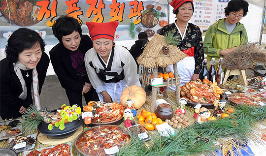 7일 전주종합경기장에서 열린 2008 전북 음식 맛 축제에서 시민들이 경연대회에 참석한 장수 진풍회관의 작품을 보고 있다.
