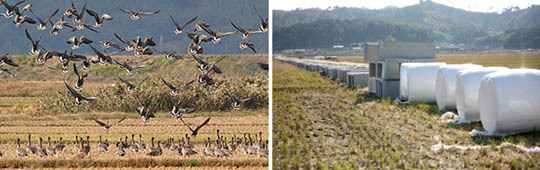 그런데 이날 오전 쉼터에서는 단 1마리의 철새도 찾아볼 수 없었다. 보름 전 본보가 촬영했을 당시 목격했던 수많은 쇠기러기 대신 원통모양의 하얀색 덩어리(사일리지)들과 공사자재(농수로 관) 및 차량들이 곳곳에 널려 있었을 뿐.