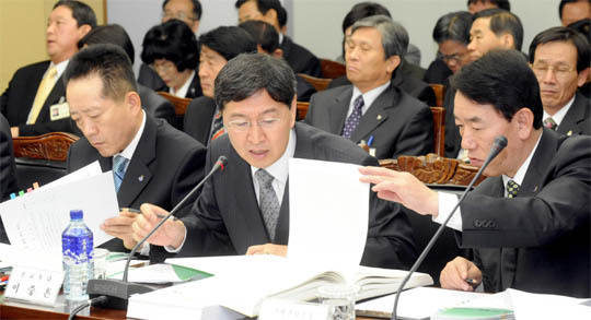 12일 전북도의회 교육복지위에서 열린 도교육청 행정사무감사에서 교육청 직원들이 의원의 질문에 답변하기위해 서류를 살펴보고 있다. 왼쪽부터 김영진 교육국장 이중흔 부교육감 임승주 기획관리국장.