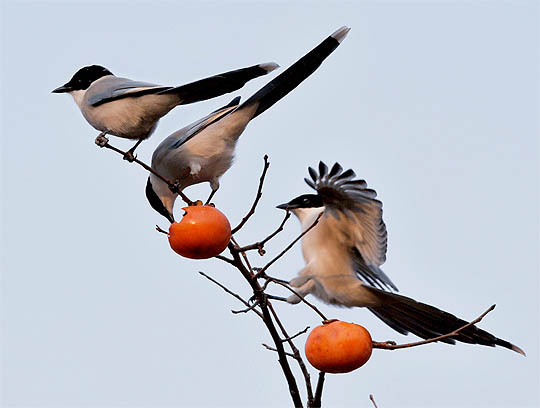 까치밥으로 남겨진 떫은 감 몇 알은 물까치가 날아들자 금세 얼굴이 붉어져 홍시가 되어 버린다.