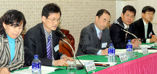 14일 전주 썬플라워컨벤션홀에서 열린 생물생명산업 포럼에서 참석자들이 종합토론을 하고 있다. 왼쪽부터 김현진 지니스대표, 최동성 우석대학교 교수, 신동화 신동화식품연구소, 조지훈 전주시의원, 권태호 전주생물소재연구소장.