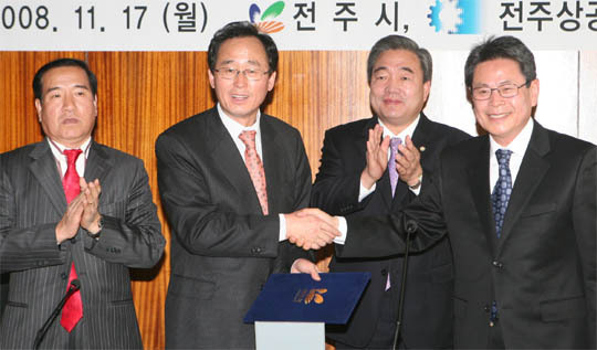 17일 전주상공회의소에서 열린 중소기업 온라인마케팅 지원사업 협약식에서 참석자들이 업무협약서에 서명 후 기념촬영을 하고 있다. (왼쪽부터 임병오 전주시의회 의원, 송하진 전주시장, 최찬욱 전주시의회 의장, 윤태섭 전주상공회의소 사무처장)
