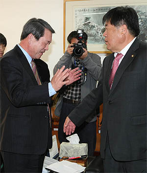쌀 직불금 관련 국정조사가 정부여당의 비협조로 난관에 봉착한 가운데 20일 오후 마포구 건강보험공단을 항의 방문한 국정조사 특위 민주당 간사인 최규성 의원이 정형근 이사장에게 직불금 수령자 명단을 열람할 수 있는 전산실 공개를 요구하고 있다.