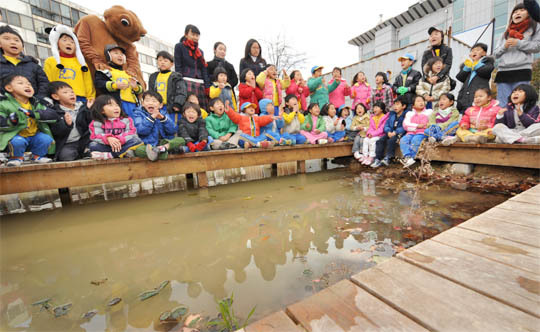 20일 전주시 삼천동 거마근린공원 내에 조성된 '맹꽁이 놀이터' 준공식에 참석한 어린아이들이 습지 주변에 앉아 선생님과 함께 큰 소리로 맹꽁이를 부르고 있다.