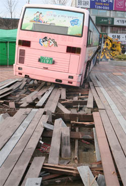 지난 22일 오후 3시께, 전주시 고사동 오거리문화광장에서 열린 한 행사에 동원된 차량이 광장으로 진입, 나무바닥이 크게 파손됐다.