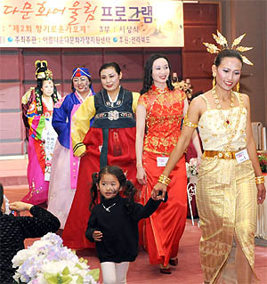 24일 전주 웨딩케슬에서 열린 지역주민과 함께하는 다문화어울림 "짱, 아름다운 발걸음 패션쇼"에서 이주여성들이 자국의 의상을 입고 무대를 걷고 있다.