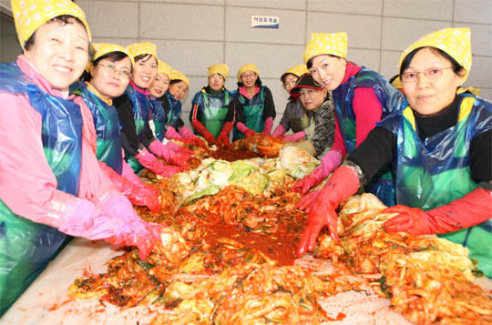 사랑의 김장김치 담그기에 참가한 군산지역 여성자원봉사자들이 활짝 웃고 있다.