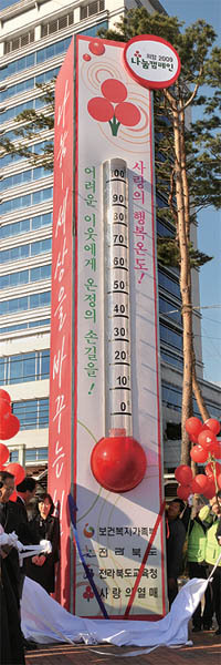 1일 전북도청 광장에서 열린 '사랑의 행복 온도탑 제막식'에 참석한 김완주 도지사와 김원배 전북사회복지공동모금회 회장 등이 아이들과 함께 성공적인 모금을 다짐하고 있다.