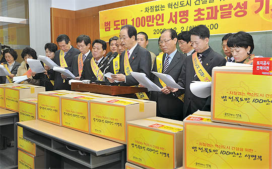 혁신도시 공공기관 이전추진 범도민 비상대책위원회가 2일 오전 전북도의회에서 117만여명의 서명부를 쌓아 놓은 상태에서 기자회견을 갖고 토공통합 중단 및 전북 혁신도시의 차질 없는 추진을 촉구하고 있다.