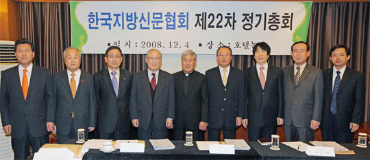 4일 오후 부산 동래구 온천동 호텔농심 2층 오팔룸에서 한국지방신문협회 제22차 정기총회가 열렸다. 사진 왼쪽부터 경인일보 송광석 사장, 경남신문 이순복 회장, 부산일보 김종렬 사장, 강원일보 최승익 회장, 매일신문 이용길 사장, 제주일보 김대성 회장, 대전일보 신수용 사장, 광주일보 김진영 사장, 전북일보 서창훈 회장.
