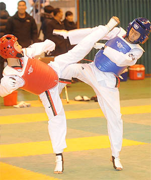 7일 우석대학교 실내체육관에서 열린 2008 전북일보배 태권도 대회에서 중등부 남자플라이급 8강 경기에 출전한 전주양지중학교 김치현(청), 최남주(홍) 선수가 대련을 하고있다.