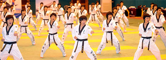 7일 우석대학교 실내체육관에서 열린 2008 전북일보배 태권도 대회에서 식후행사로 우석대학교 태권도학과 시범단들이 에피소드11 명성황후 공연을 펼치고 있다.