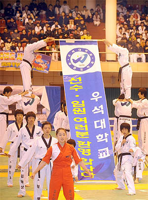 7일 우석대학교 실내체육관에서 열린 2008 전북일보배 태권도 대회에서 우석대학교 태권도학과시범단들이 에피소드11(명성황후) 공연을 마치고 선수와 임원 여러분을 환영하는 플래카드를 선보이고 있다.