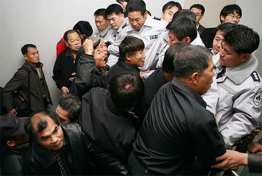 11일 열린 군산시와 한국전력의 '군산산단·새만금지구 전력공급설비 설치 협약식'에서 주민들이 MOU 체결의 중단을 요구하며 청원경찰들과 몸싸움을 벌이고 있다. 오균진(moscow14@daum.net)