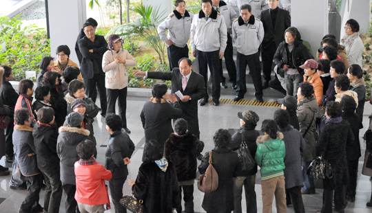 전북도가 15일 전주덕진실내수영장 폐장을 결정하자 덕진수영장 동호회원 50여명이 전북도청 로비에서 수영장 폐장 철회를 촉구하며 도지사와의 면담을 요청하고 있다.