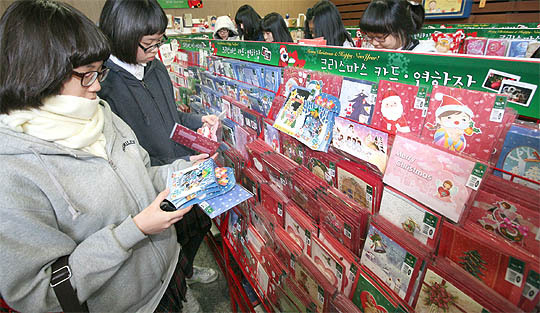 크리스마스를 3일 앞둔 22일 전주시내 문구점에서 학생들이 크리스마스카드와 연하장을 고르고 있다.
