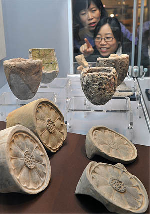 24일 개관을 앞둔 왕궁리유적전시관에서 학예사들이 왕궁리 유적의 가장 대표적인 백제 연화문 수막새(앞)와 왕궁리 유적 공방지에서 출토된 금동 유리 도가니를 살펴보고 있다.