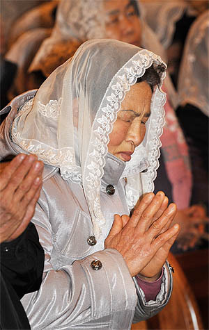 25일 전동성당을 찾은 할머니는 두 눈을 감고 두 손을 모았습니다.