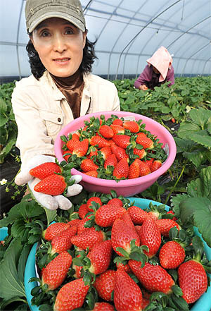 28일 완주군 삼례읍 구와리 유희태씨(45)의 딸기밭에서 당도가 높고 육질이 단단한 신품종 딸기 '매향'에 대한 수확이 한창이다.