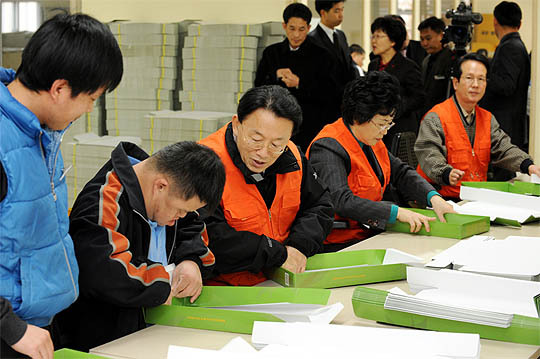 김완주 도지사와 전북도청 실국장들이 26일 송년모임에 앞서 동암 재활원을 방문해 장애인들과 함께 한지접기와 박스접기 등의 봉사활동을 하고 있다.