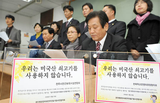 광우병청정지대 전주만들기 범시민협의회가 30일 전주시청 브리핑룸에서 기자회견을 열어 미국산 쇠고기를 사용하지 않기로 한 식당과 유치원·보육시설을 발표하고 있다.