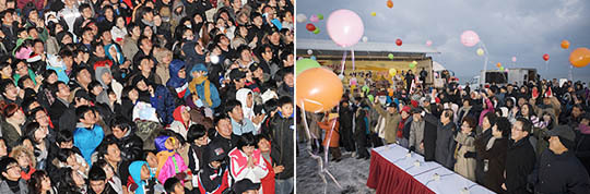 "잘가라 2008년" 31일 밤부터 전주시 풍남문에서 열린 제야 행사에 참여한 3000여명의 시민들이 새해 소망을 빌고 있다(좌). "반갑다 2009년" 폭설을 뚫고 군산 새만금 방조제를 찾은 방문객들이 새해 첫 태양이 떠오르자 일제히 환호성을 지르고 있다. 안봉주(bjahn@jjan.kr)