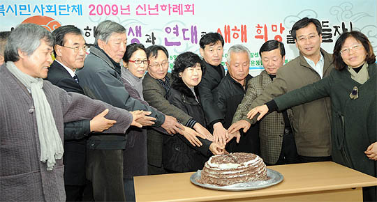 전라북도 시민사회단체 2009 신년하례회, 참석자들이 떡을 자르고 있다.