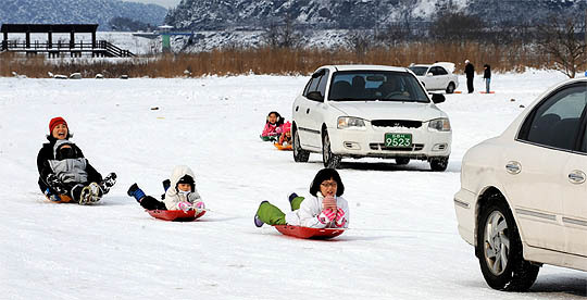 11일 도내 일부지역에 대설주의보가 발효된 가운데 정읍 내장산 자동차 주차장에서 시민들이 자동차를 이용한 썰매를 타고 있다.