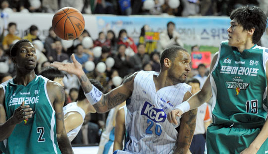 11일 전주실내체육관에서 열린 프로농구 전주 KCC와 원주 동부 경기에서 KCC 마이카 브랜드 선수가 줄곳을 찾고 있다.