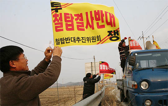 군산 회현면 주민들이 송전 철탑 건설에 반대하는 홍보물을 설치하고 있다. 오균진(moscow14@daum.net)