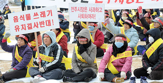12일 전주시청 앞 노송광장에서 전주 삼천동 주민 300여명이 전주시의 리사이클링 사업(음식물 쓰레기, 대형 폐기물 처리단지)'의 중지를 촉구하는 집회를 하고 있다.