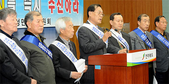 무주군 사회단체 협의회와 기업도시 안성면 대책위원회가 14일 도청 브리핑룸에서 대한전선의 기업도시 즉시 추진 촉구 기자회견을 하고 있다.