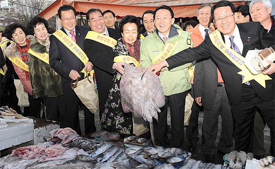 19일 전주 중앙시장에서 김완주지사와 참석자들이 범도민 설맞이 전통시장 장보기를 하고 있다.