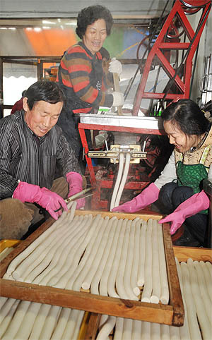 설명절을 닷새 앞둔 21일 전주 삼천동 우성아파트 상가내 우성떡방앗간에서 주인인 김호덕·양혜순 부부가 가래떡을 뽑고 있다.