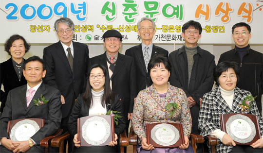 '2009 전북일보 신춘문예' 시상식이 21일 오후 3시 전북일보 본사 회의실에서 열렸다. (뒷줄 왼쪽부터) 최정선 정양 이운룡 윤이현 김병용 김종필 심사위원과 (앞줄 왼쪽부터) 당선자들과 심사위원들이 기념촬영을 하고 있다. (앞줄 왼쪽부터) 안성덕 황정연 신성애 장은영 당선자.