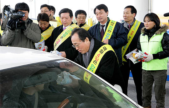 송하진 전주시장이 민족 최대 명절인 설 연휴를 맞아 23일 전주 나들목에서 안전문화 홍보 캠페인을 벌였다.