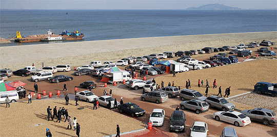 안전상의 문제로 일반인 출입을 통제하던 새만금 방조제 공사구간이 설명절 연휴기간 임시로 개방됐다. 설날인 지난 26일 방문객들이 신시도 배수갑문에서 새만금의 위용을 구경하고 있다.