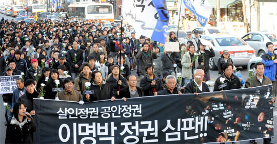 지난 31일 전주 오거리문화광장에서 시민과, 시민사회단체회원 300여명이 용산 사태 관련 범정부 규탄대회를 마치고 한라라당 전북도당까지 거리 행진을 하고 있다.