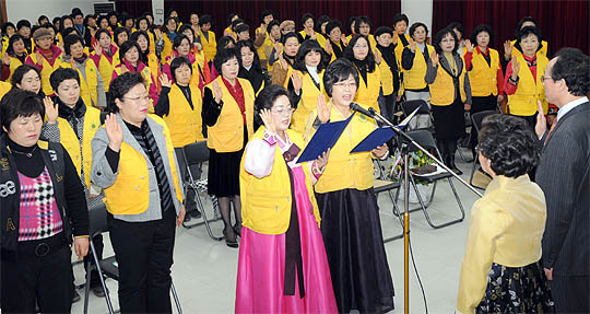 지난달 30일 완산구청 강당에서 열린 아동 식품권 안전지킴이 발대식에서 해바라기 봉사단들이 아동의 건강증진과 식품권 부정 사용 근절에 앞장서겠다는 결의문을 낭독하고 있다.