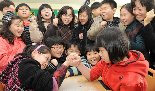 지난 31일 겨울방학을 마치고 개학을 한 전주 우전초등학교에서 학생들이 팔씨름을 하며 개학을 즐거워 하고 있다.